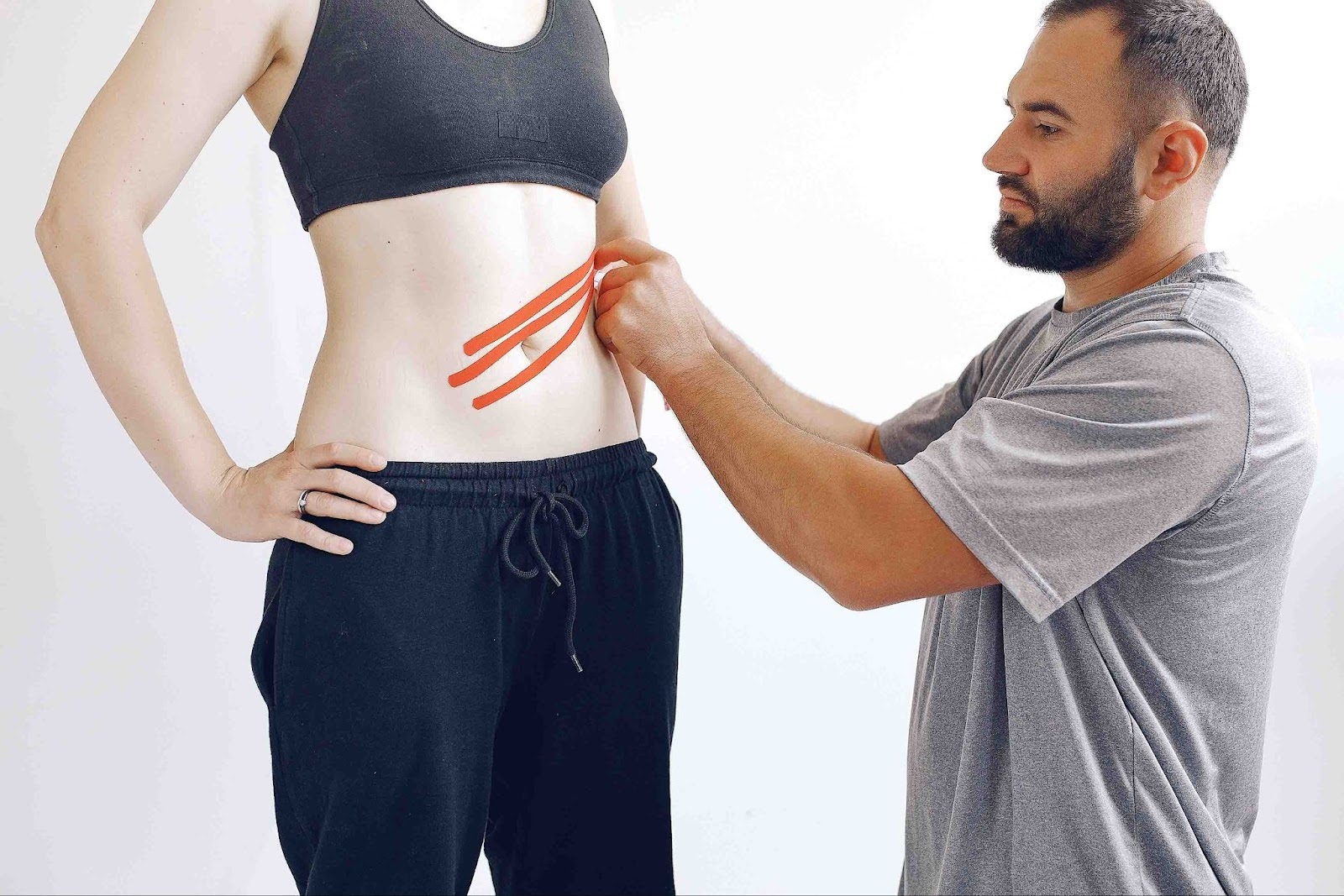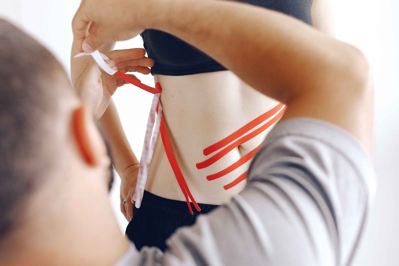 Наклеивать ленты на живот и бедра желательно в положении лежа по направлению снизу вверх. Последние тейпы следует накладывать без лишнего натяжения, чтобы избежать раздражения кожи и дискомфорта.
